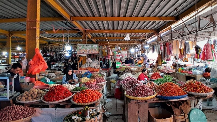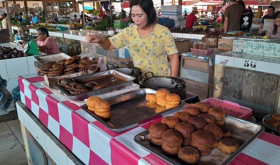 Tomohon traditional food market with typical local cakes, spices and domestic fuits.